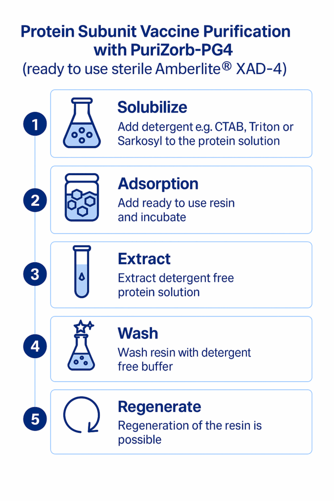 Purivise supplies and develops Innovative Resin Technology for Biopharmaceutical Purification. Our core product is PuriZorb-PG4, a sterile, endotoxin-free, purified and activated Amberlite® XAD-4 resin suspension supplied in 2L polycarbonate bottles, ready-to-use in PBS buffer. Unlike dry-packaged adsorbents or column cartridges, PuriZorb-PG4 requires no equilibration or washing steps prior to use. Simply add it directly to the protein, vaccine, or biomolecule solution to rapidly remove detergents and hydrophobic impurities.
